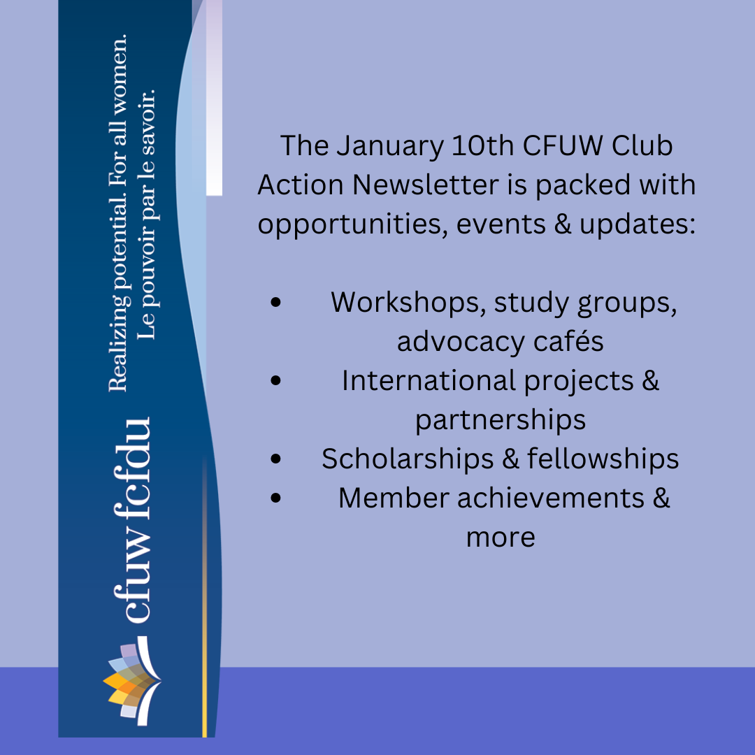 Check Out this week’s Club Action Newsletter for CFUW updates & opportunities Posted byInfoJanuary 13, 2025January 12, 2025Posted inUncategorized Exciting Updates & Opportunities: January 10 CFUW Club Action Newsletter! https://cutt.ly/We29dbWz Share this: Click to share on Facebook (Opens in new window) Facebook Click to share on X (Opens in new window) X Click to share on Pinterest (Opens in new window) Pinterest Click to email a link to a friend (Opens in new window) Email Click to share on LinkedIn (Opens in new window) LinkedIn Click to print (Opens in new window) Print Like Loading... Related