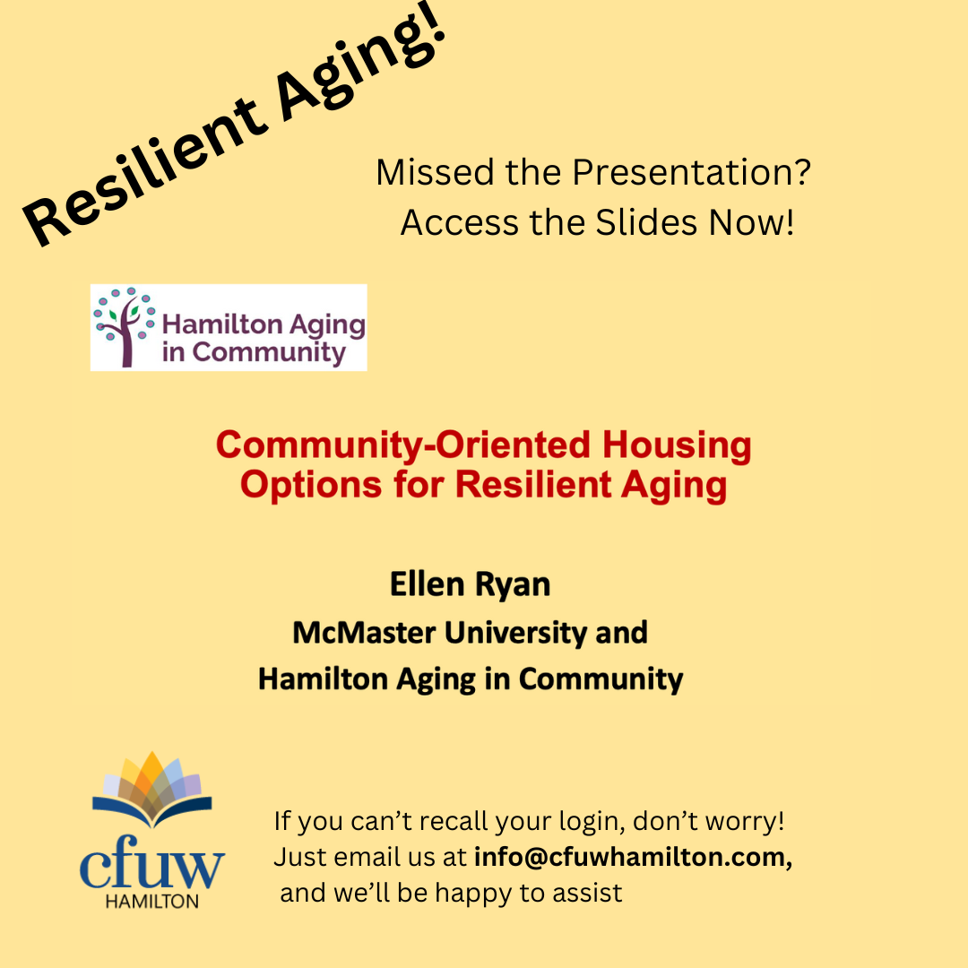 If you missed Dr. Ellen Ryan’s insightful presentation on Resilient Aging, we have great news! She has kindly given us permission to share her slides. CFUW Hamilton members can log in to the Members Only section of our website to view or revisit the presentation.