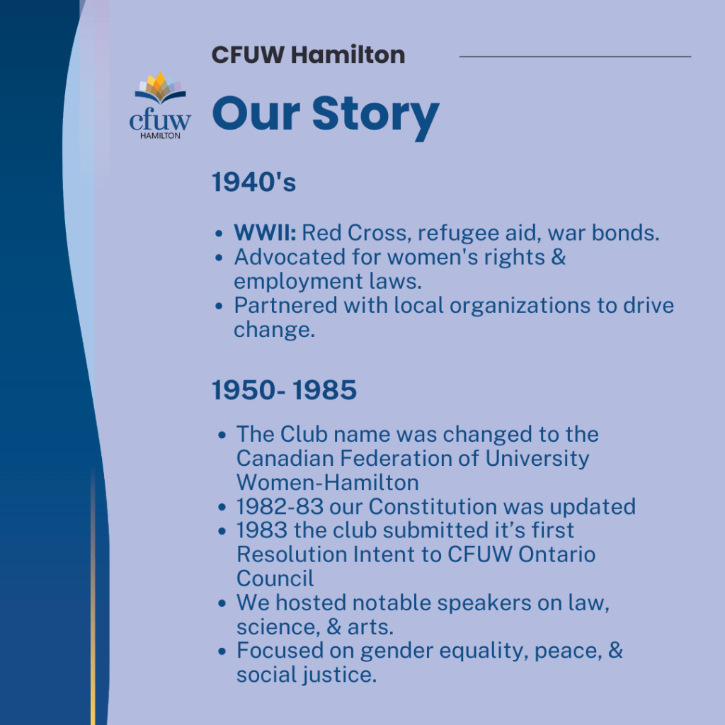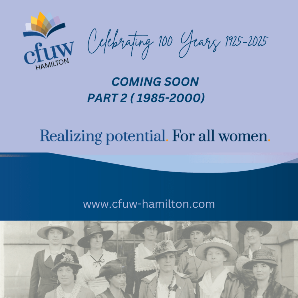Thanks for the anniversary greetings! Many asked about CFUW Hamilton’s history—here’s Our Story: Part 1 (1925–1985). Stay tuned for Parts 2 & 3! #CFUWHamilton #OurHistory