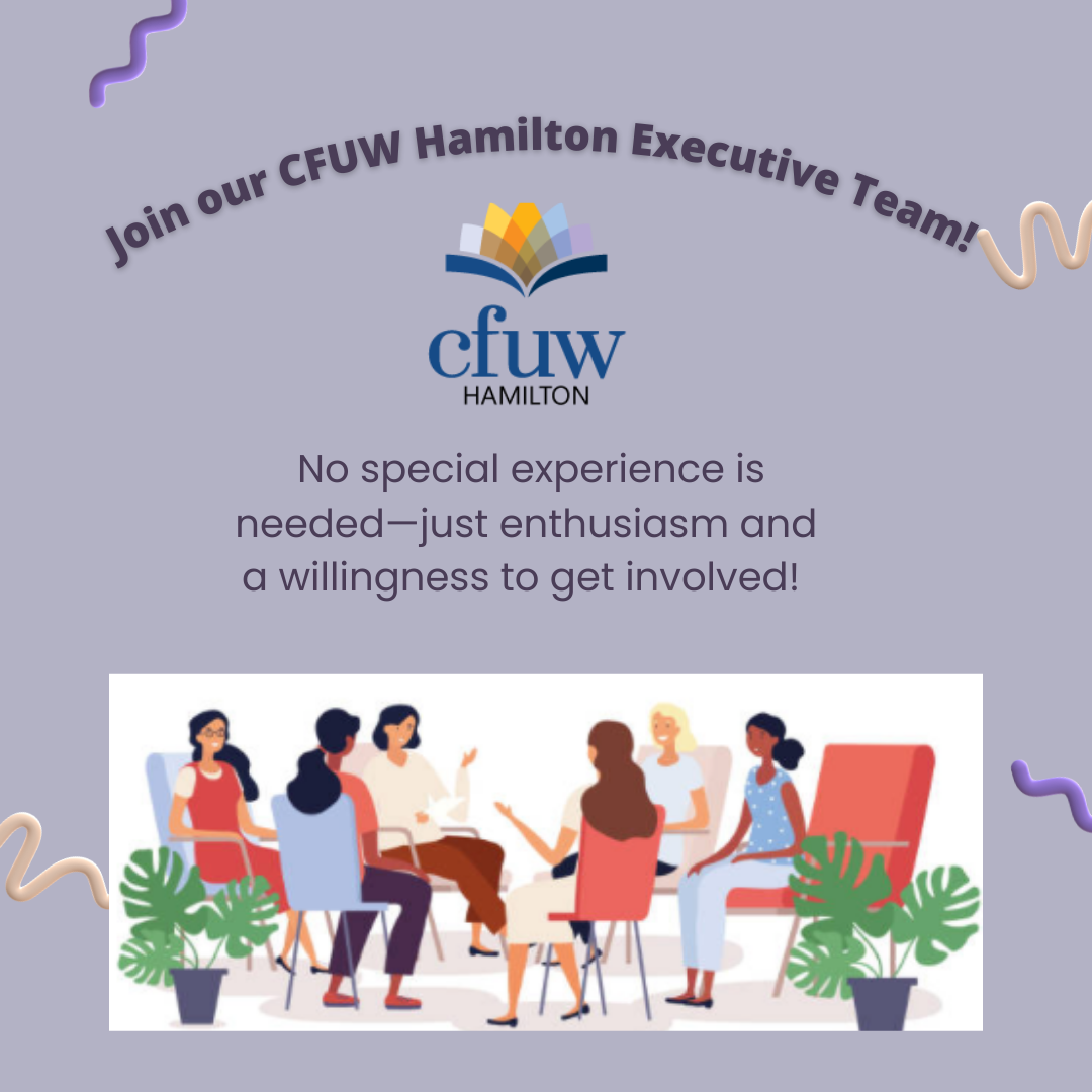 Join Our CFUW Hamilton Executive Team! Posted byInfoMarch 10, 2025March 7, 2025Posted inUncategorized We’re looking for members to step into leadership roles—no special experience is needed, just a willingness to get involved! Details are in the Members Only section of our website. Need login help? Let us know! #CFUWHamilton #GetInvolved Share this: Share on Facebook (Opens in new window) Facebook Share on X (Opens in new window) X Share on Pinterest (Opens in new window) Pinterest Email a link to a friend (Opens in new window) Email Share on LinkedIn (Opens in new window) LinkedIn Print (Opens in new window) Print Like Loading... Related