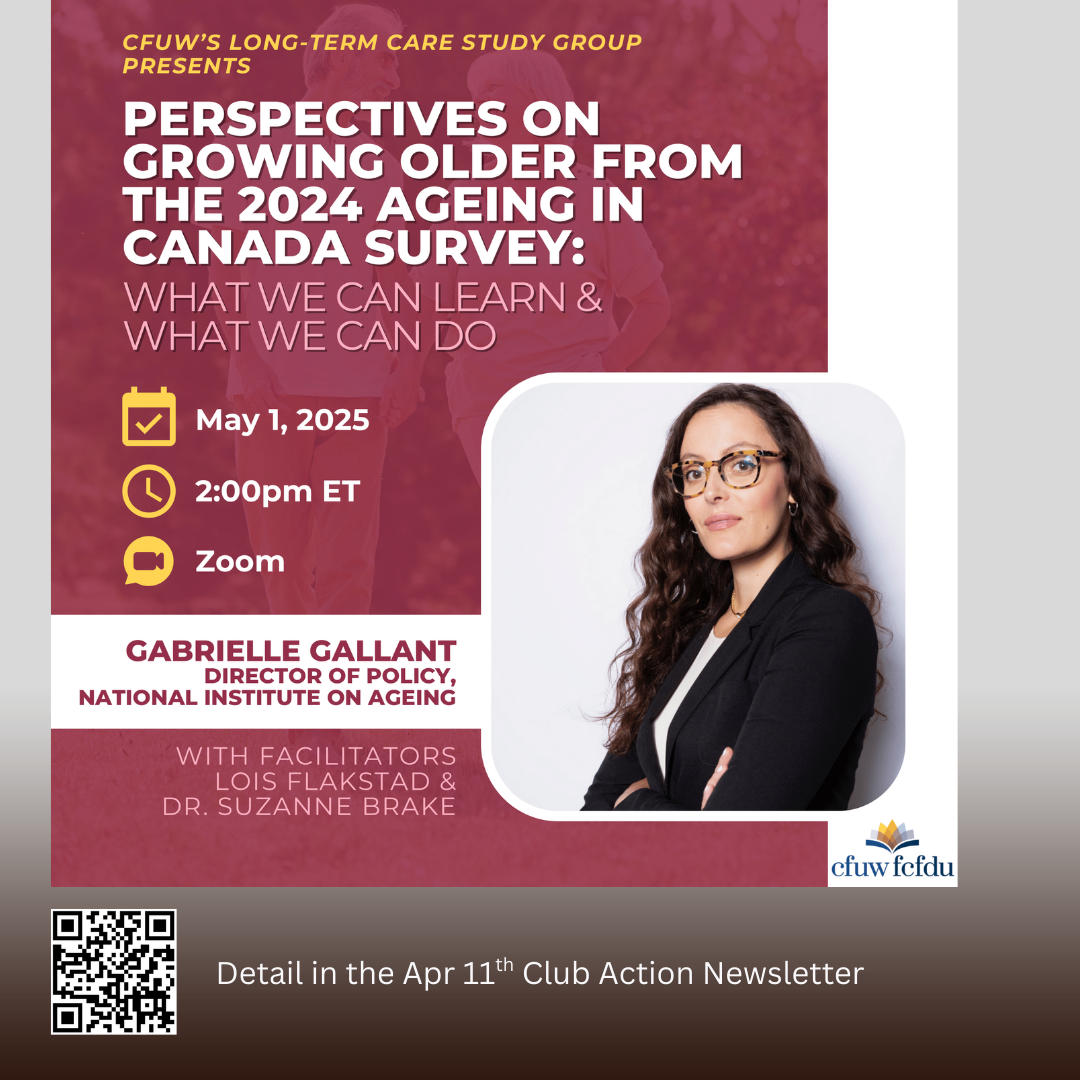 Join the CFUW Long-Term Care Study Group for a talk by the National Institute on Ageing’s Director of Policy! 🧓🗣️ Register via the April 11 Club Action Newsletter: https://cutt.ly/brf7opu9 #LongTermCare #AgingWell #CFUW #HealthyAging #SeniorCare #PolicyMatters
