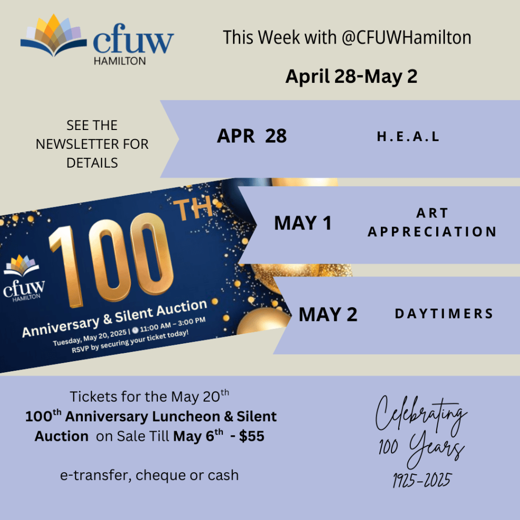 This week at CFUW Hamilton: Get inspired, stay active, and connect! 🎉 Reserve now for our May 20th 100th Anniversary Luncheon & Silent Auction! #CFUWHamilton #100YearsStrong
