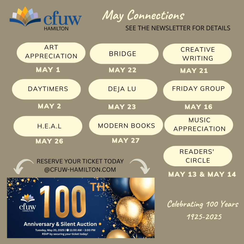 May is full of chances to connect! Check out the interest group dates and donβt miss your chance to get tickets for our 100th Anniversary Luncheon & Silent Auction β ticket sales close May 6th! πβ¨