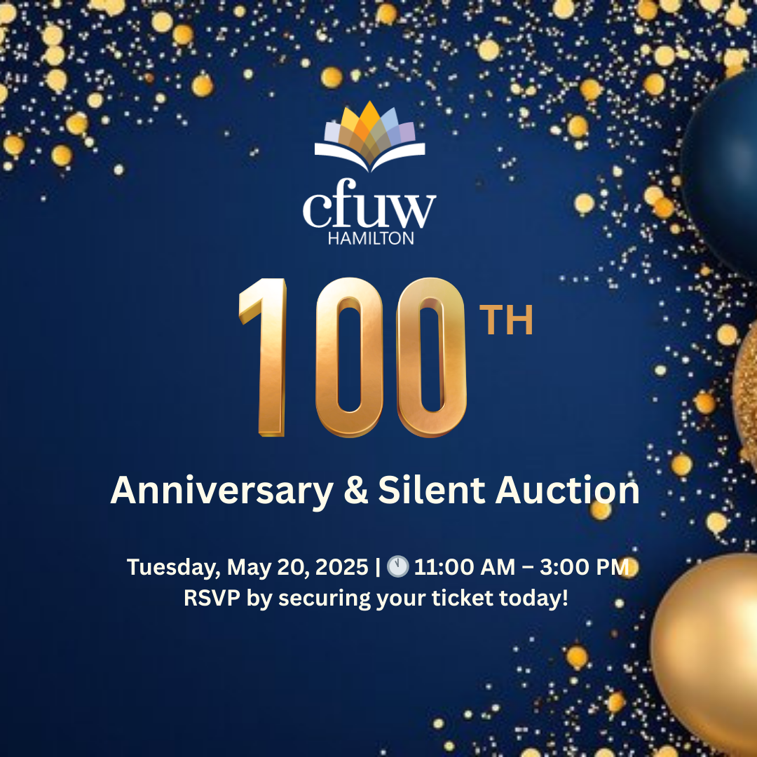 CFUW Hamilton is celebrating 100 years! Join us for a special Anniversary Luncheon on May 20, 2025, at Liuna Station. Tickets: $55 — e-transfer, cash, or cheque. Deadline: May 6! Free parking on-site Reserve today: cfuw-hamilton.com #CFUWHamilton100 #CFUWHamilton