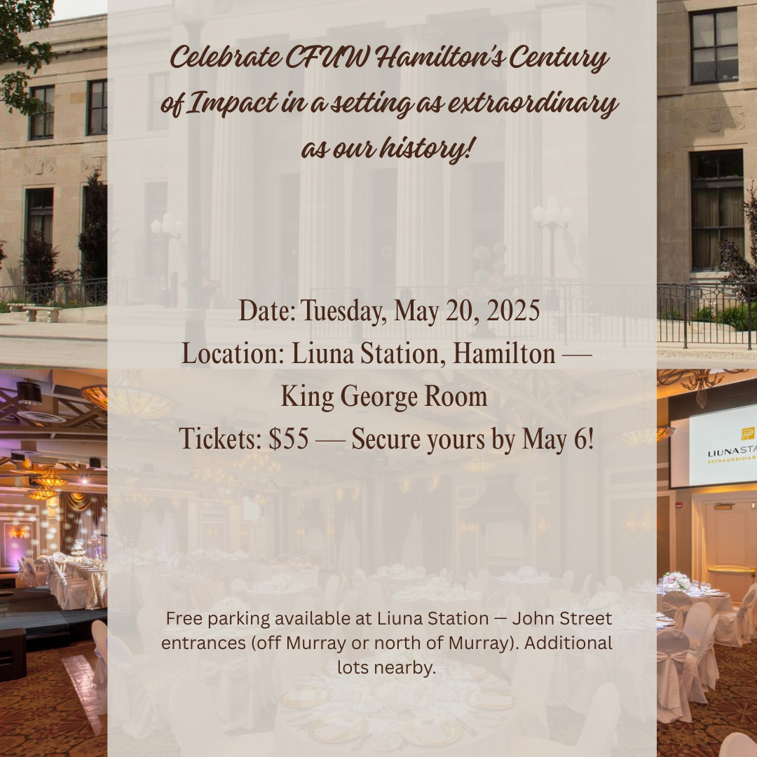 ποΈ Join us as we celebrate 100 years of CFUW Hamilton at the beautiful, historic Liuna Station!π Right in the heart of Hamilton, with free on-site parking off John Street (north of Murray, near the King George Ballroom entrance)
