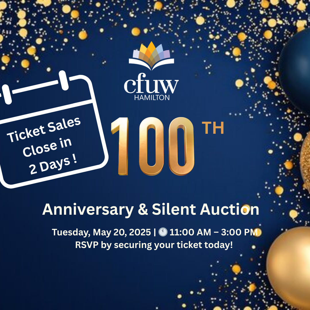 ⏳ Just 2 days left to get your ticket to the CFUW Hamilton 100th Anniversary Luncheon!📅 Ticket sales end May 6 — don’t miss out!🔗 Visit us at cfuw-hamilton.com to reserve your ticket today — we can’t wait to celebrate with you! #CFUWHamilton #100Years #FinalCountdown