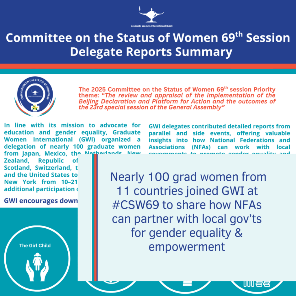 đ Nearly 100 grad women from 11 countries joined GWI at #CSW69 to share how NFAs can partner with local govâtsfor gender equality & empowerment.đ Download the Delegate Report Summary: https://cutt.ly/7rluL9Fc#GenderEquality #WomensEmpowerment #BeijingPlatform #GWI #CFUW