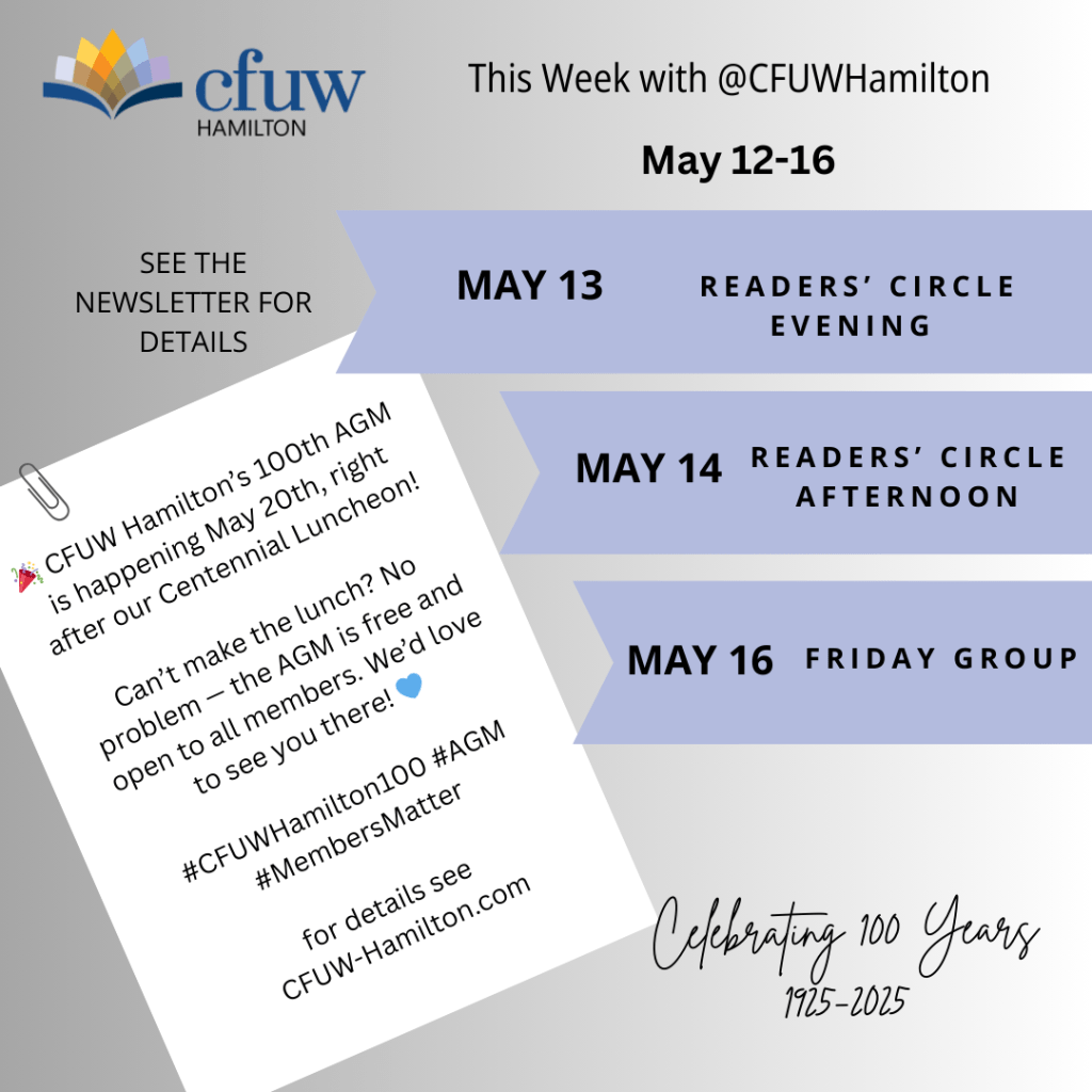 ✨ This Week with CFUW Hamilton ✨ Posted byInfoMay 11, 2025May 10, 2025Posted inUncategorized Stay connected, stay inspired — here’s what’s happening this week with our club! #CFUWHamilton #ThisWeekWithCFUW #LifelongLearning #WomenInCommunity #CFUWStrong #WhatWeDo Share this: Share on Facebook (Opens in new window) Facebook Share on X (Opens in new window) X Share on Pinterest (Opens in new window) Pinterest Email a link to a friend (Opens in new window) Email Share on LinkedIn (Opens in new window) LinkedIn Print (Opens in new window) Print Like Loading... Related