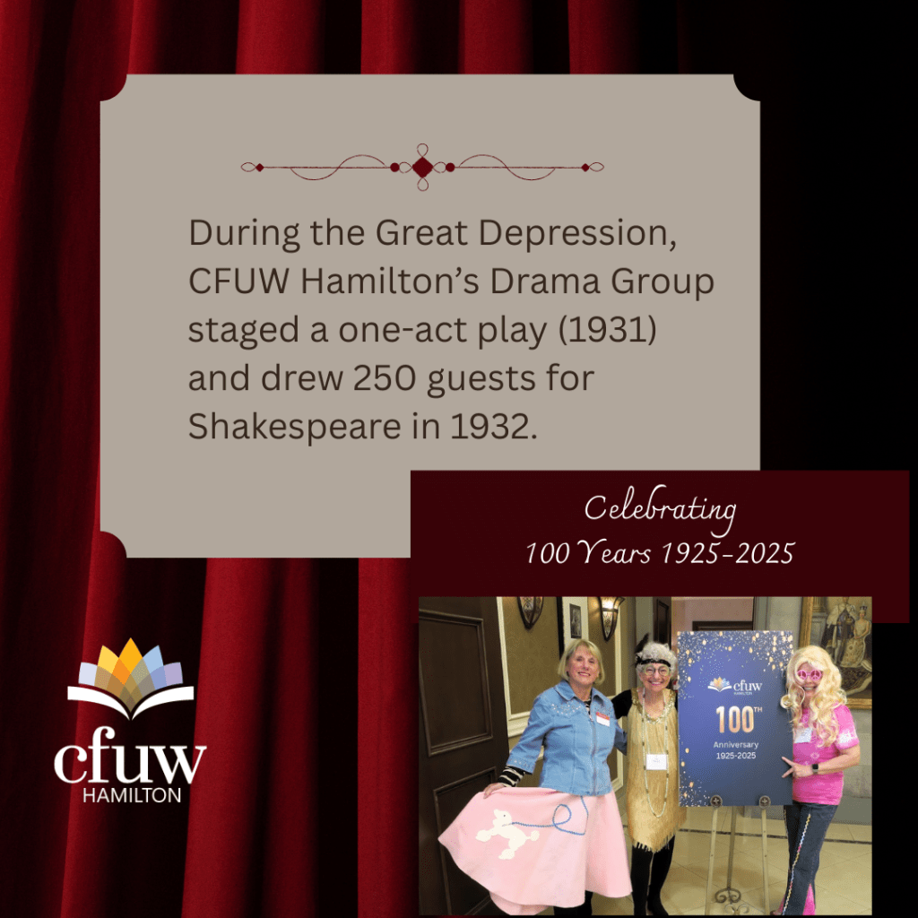 Spotlight on our 1930s drama group! During the Great Depression, CFUW Hamilton staged a one-act play (1931) and drew 250 guests for Shakespeare with Harry Irvine (1932).