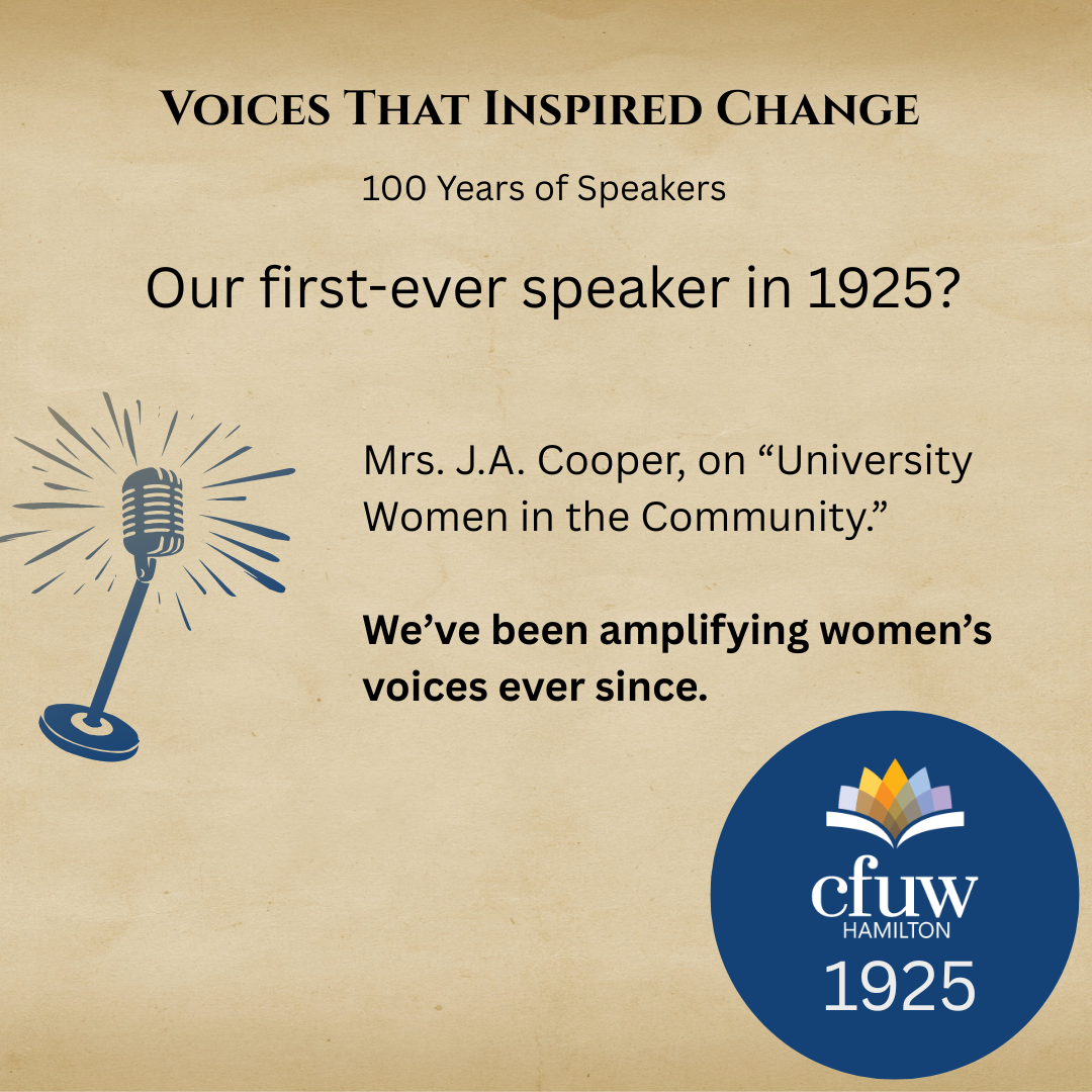 🎙️ Our first-ever speaker in 1925? Mrs. J.A. Cooper, on “University Women in the Community.” We’ve been amplifying women’s voices ever since. #SpeakerSeries #WomenWhoLead #cfuwhamilton100