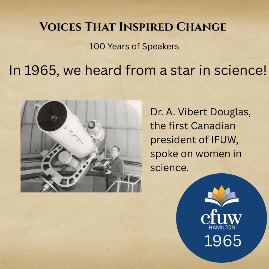 In 1965, we heard from a star in science! Dr. A. Vibert Douglas, the first Canadian president of IFUW, spoke on women in science. #WomenInSTEM #LegacyOfLearning #CFUWHamilton