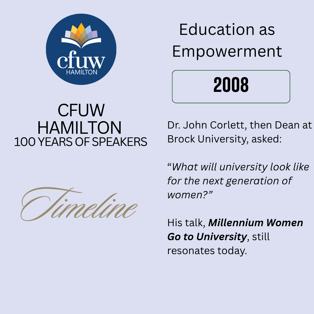 Celebrating 100 years of inspiring voices! 🎉 In 2008, Dr. John Corlett posed the important question: What’s next for women in higher education? This topic remains relevant today! #WomenInHigherEd #CFUW100