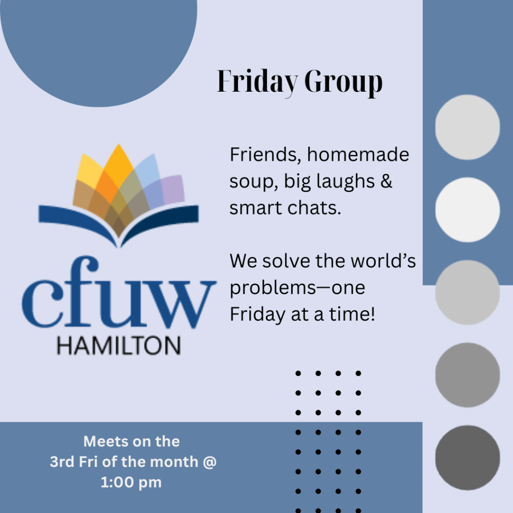 #100YearsOfConnection Posted byInfoJuly 18, 2025July 14, 2025Posted inUncategorized Friendship, laughter, and a place to belong. #100YearsOfConnection #WomenWhoWrite #CFUWHamilton Share this: Click to share on Facebook (Opens in new window) Facebook Click to share on X (Opens in new window) X Click to share on Pinterest (Opens in new window) Pinterest Click to email a link to a friend (Opens in new window) Email Click to share on LinkedIn (Opens in new window) LinkedIn Click to print (Opens in new window) Print Like Loading... Related
