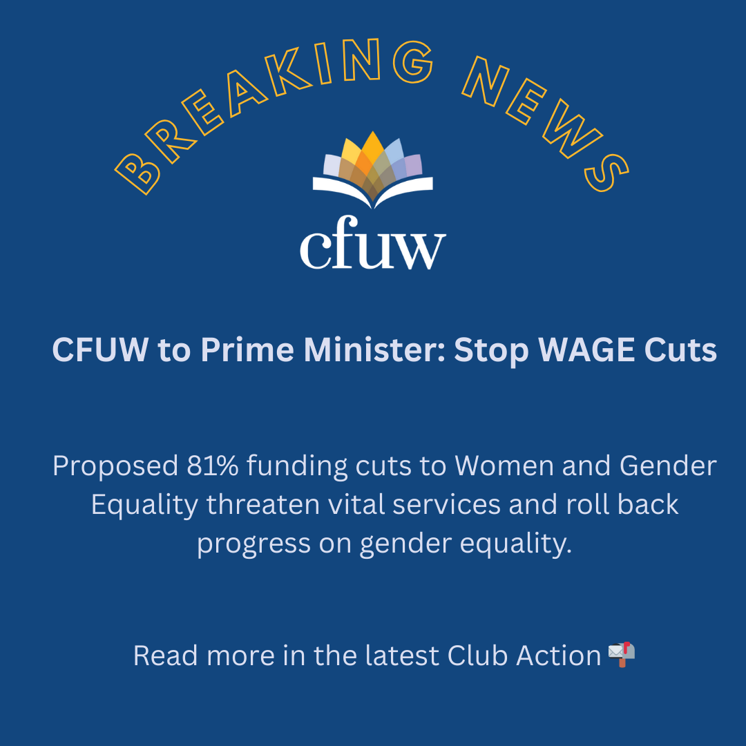 ✉️ CFUW urges the PM: Stop the 81% cut to WAGE funding. These drastic reductions threaten vital services & roll back progress on gender equality.