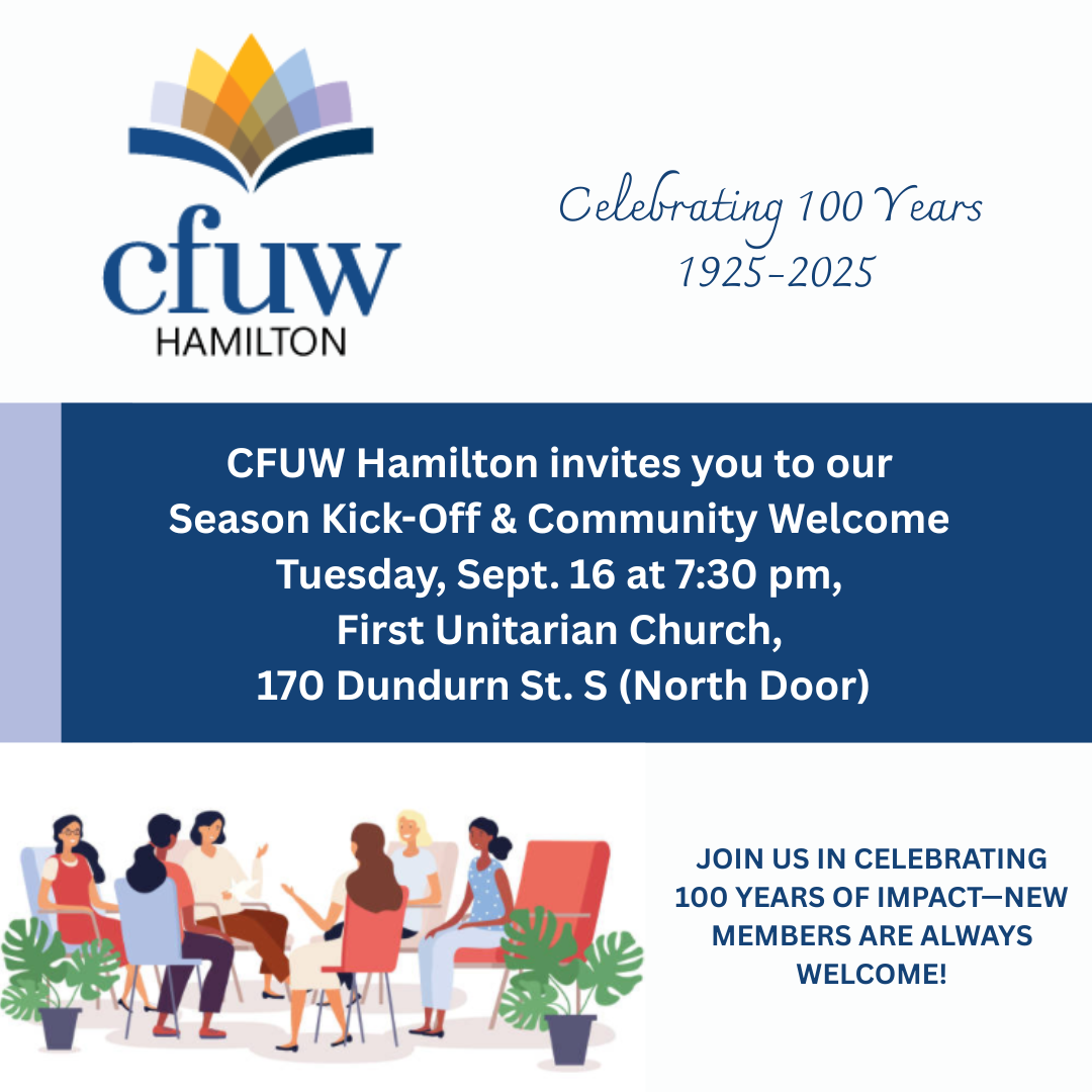 CFUW Hamilton invites you to our Season Kick-Off & Community Welcome on Tuesday, Sept. 16 at 7:30 pm, First Unitarian Church, 170 Dundurn St. S (North Door). Come connect, learn, and belong. New members welcome! https://cutt.ly/OrXzqy2N