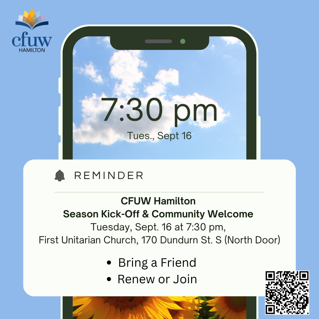 Meeting Tonight! Posted byInfoSeptember 16, 2025September 11, 2025Posted inUncategorized New season, 100 years of impact! CFUW Hamilton meeting tonight 7:30 PM. Join or renew!🔗 https://cutt.ly/Join-CFUW-Hamilton #100YearsStrong Share this: Click to share on Facebook (Opens in new window) Facebook Click to share on X (Opens in new window) X Click to share on Pinterest (Opens in new window) Pinterest Click to email a link to a friend (Opens in new window) Email Click to share on LinkedIn (Opens in new window) LinkedIn Click to print (Opens in new window) Print Like Loading... Related