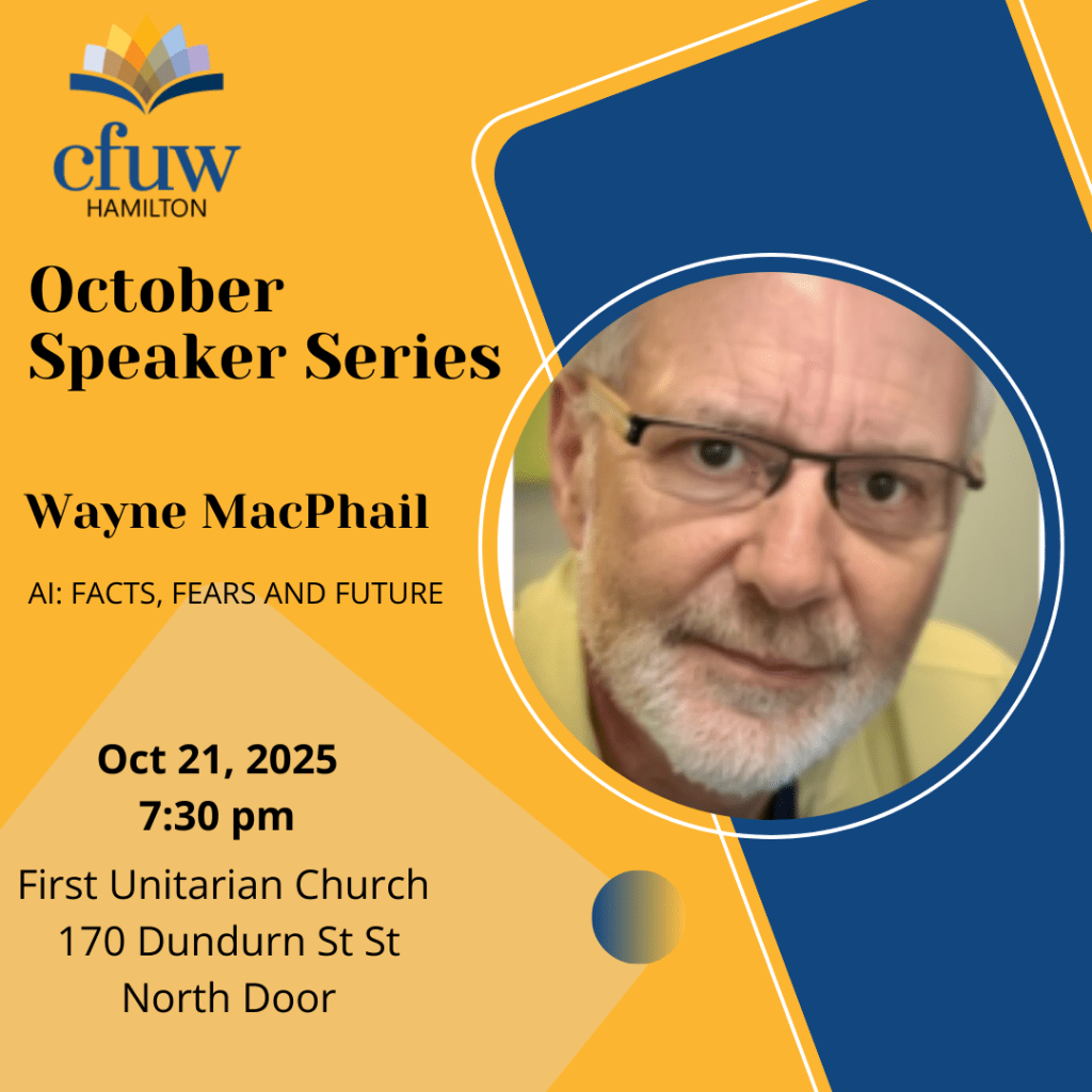 Curious what AI means for you? Join Wayne MacPhail at CFUW Hamilton’s October Speaker Series for a plain-language look at AI’s risks, benefits & future.