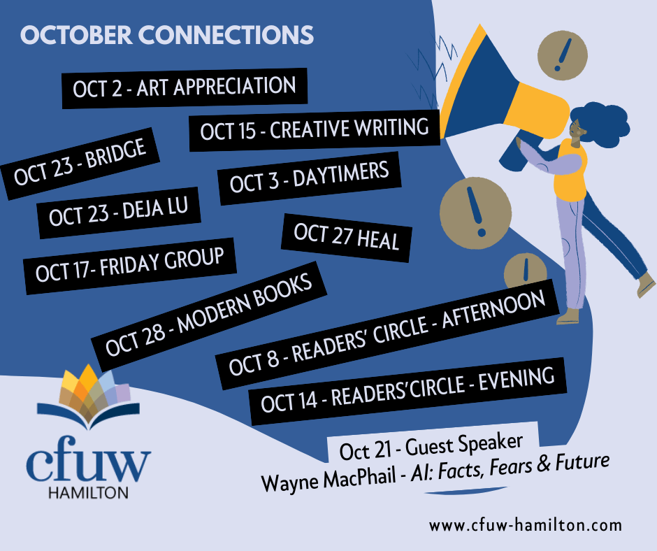 Connect, Learn, Enjoy – October Events Await! Posted byInfoOctober 3, 2025October 2, 2025Posted inUncategorized Connect, Learn, Enjoy – CFUW Hamilton October Events Await #CFUWHamilton #100Years Share this: Click to share on Facebook (Opens in new window) Facebook Click to share on X (Opens in new window) X Click to share on Pinterest (Opens in new window) Pinterest Click to email a link to a friend (Opens in new window) Email Click to share on LinkedIn (Opens in new window) LinkedIn Click to print (Opens in new window) Print Like Loading... Related