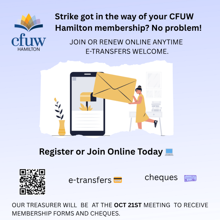 📬 Strike got in the way of your CFUW Hamilton membership? No problem! Join or renew online anytime—e-transfers welcome. 🌸💻