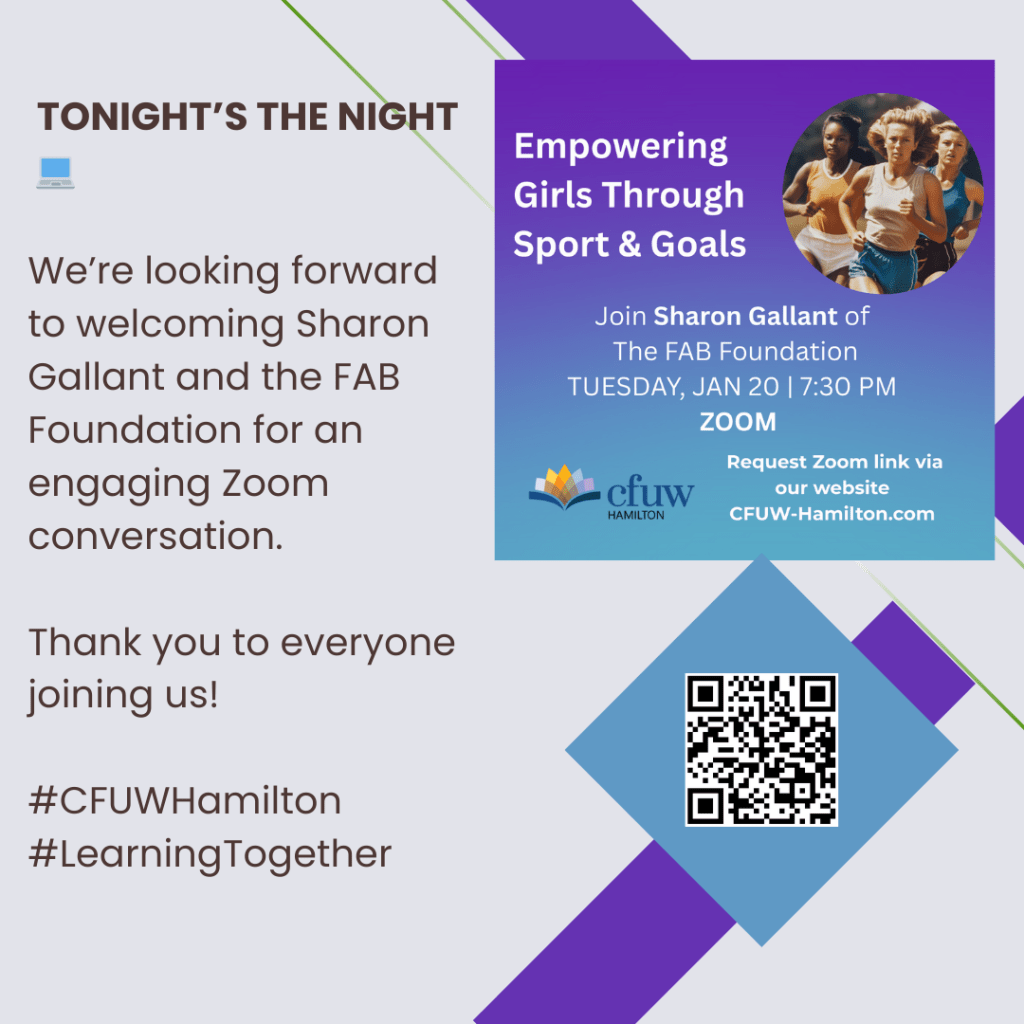 Happening tonight! Posted byInfoJanuary 20, 2026January 11, 2026Posted inUncategorized CFUW Hamilton’s January Zoom talk with Sharon Gallant and the FAB Foundation. We can’t wait to see you online. Share this: Share on Facebook (Opens in new window) Facebook Share on X (Opens in new window) X Share on Pinterest (Opens in new window) Pinterest Email a link to a friend (Opens in new window) Email Share on LinkedIn (Opens in new window) LinkedIn Print (Opens in new window) Print Like Loading... Related