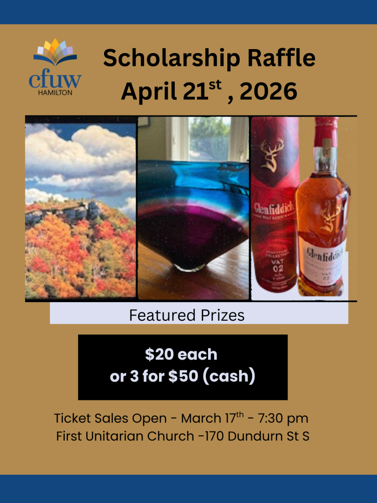 🏆 Amazing Prizes Await! Posted byInfoMarch 13, 2026March 11, 2026Posted inUncategorized 🏆 Amazing Prizes Await!🎟 Tickets on sale March 17 | 7:30 PM📍 First Unitarian Church, 170 Dundurn St S💵 Cash only | Everyone welcome🎓 Win incredible prizes while supporting scholarships!#CFUWHamilton #ScholarshipsMatter #CFUWHamilton #ScholarshipsMatter Share this: Share on Facebook (Opens in new window) Facebook Share on X (Opens in new window) X Share on Pinterest (Opens in new window) Pinterest Email a link to a friend (Opens in new window) Email Share on LinkedIn (Opens in new window) LinkedIn Print (Opens in new window) Print Like Loading... Related