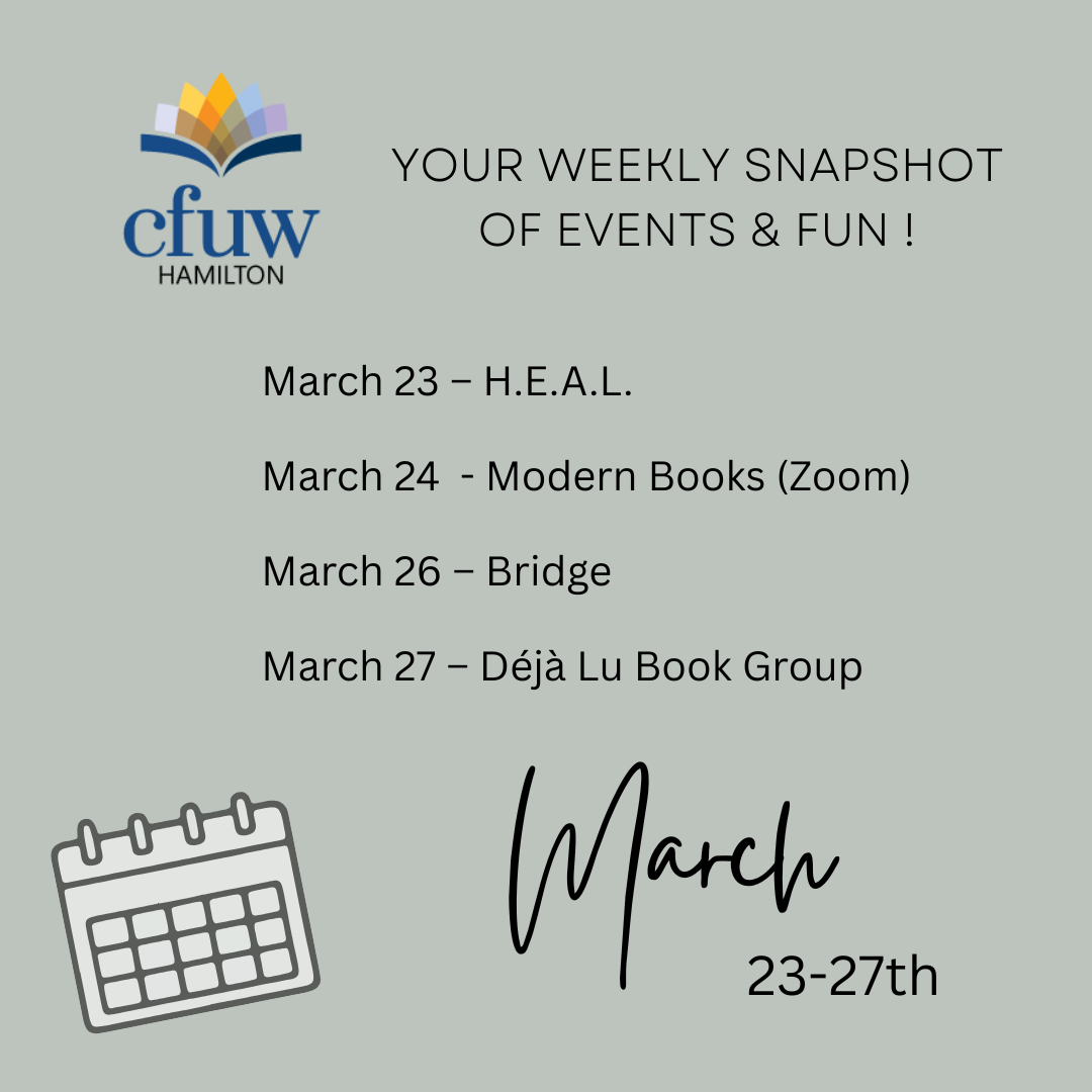 💬 Connection, conversation, and a little fun—here’s your CFUW Hamilton week at a glance! Posted byInfoMarch 22, 2026March 21, 2026Posted inUncategorized 💬 Connection, conversation, and a little fun—here’s your CFUW Hamilton week at a glance! #CFUWHamilton #ThisWeek #CommunityConnections #LifelongLearning #WomenSupportingWomen #GetInvolved Share this: Share on Facebook (Opens in new window) Facebook Share on X (Opens in new window) X Share on Pinterest (Opens in new window) Pinterest Email a link to a friend (Opens in new window) Email Share on LinkedIn (Opens in new window) LinkedIn Print (Opens in new window) Print Like Loading... Related