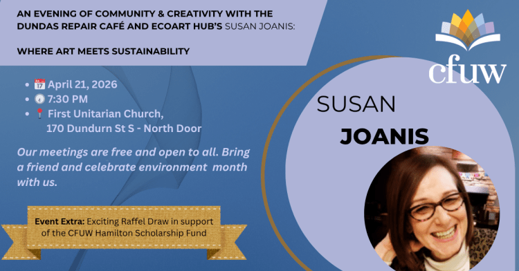 Join us April 21, 7:30 PM for Where Art Meets Sustainability with Susan Joanis! Posted byInfoApril 15, 2026April 13, 2026Posted inUncategorized Join us April 21, 7:30 PM for Where Art Meets Sustainability with Susan Joanis (Dundas Repair Café).First Unitarian Church (North Door). Free—bring a friend!Bonus: Scholarship Raffle Draw 🎟️Celebrate Environment Month 🌿 Share this: Share on Facebook (Opens in new window) Facebook Share on X (Opens in new window) X Share on Pinterest (Opens in new window) Pinterest Email a link to a friend (Opens in new window) Email Share on LinkedIn (Opens in new window) LinkedIn Print (Opens in new window) Print Like Loading... Related