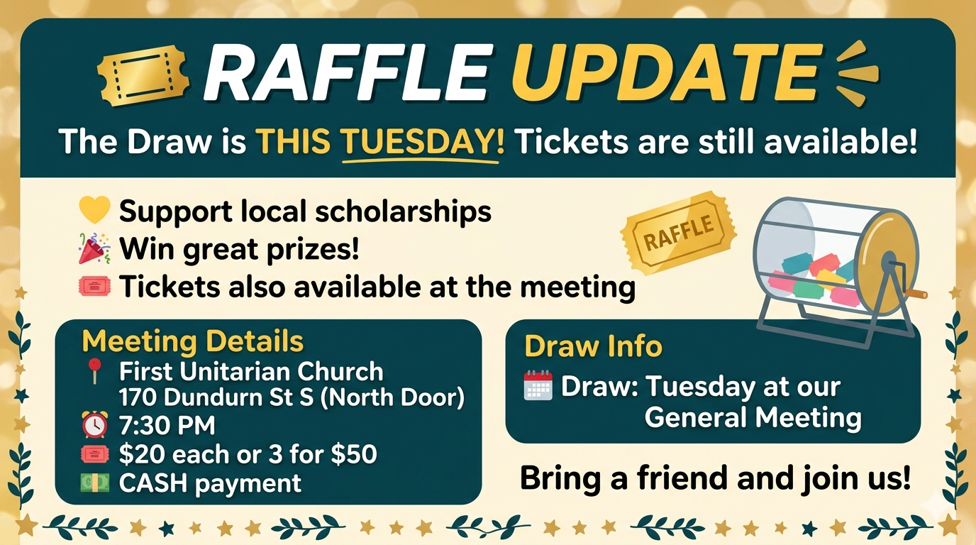 🎟️ RAFFLE UPDATE Posted byInfoApril 18, 2026Posted inUncategorized 🎟️ RAFFLE UPDATEDraw this Tuesday—tickets still available!💛 Support scholarships | 🎉 Win prizes 📍 First Unitarian Church (North Door)⏰ 7:30 PM🎟️ $20 or 3 for $50 (cash) Join us & bring a friend! Share this: Share on Facebook (Opens in new window) Facebook Share on X (Opens in new window) X Share on Pinterest (Opens in new window) Pinterest Email a link to a friend (Opens in new window) Email Share on LinkedIn (Opens in new window) LinkedIn Print (Opens in new window) Print Like Loading... Related