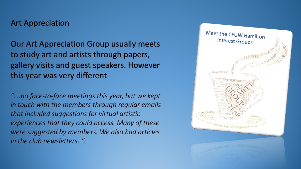CFUW members are invited to attend the AGM & Conference Evening of Awards, Entertainment, and Conversation, June 24, 2021, at 6 pm eastern time. For more details and registration information, please click on the link below