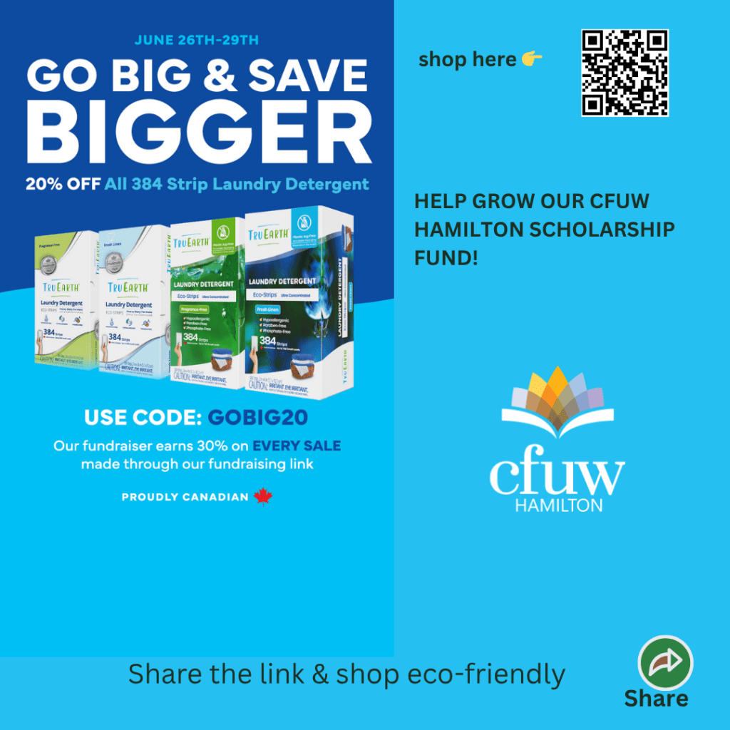 🧼 Help grow our CFUW Hamilton Scholarship Fund! 30% of every eco-friendly Tru Earth purchase supports scholarships — only until June 30! 📣 Share the link & shop: