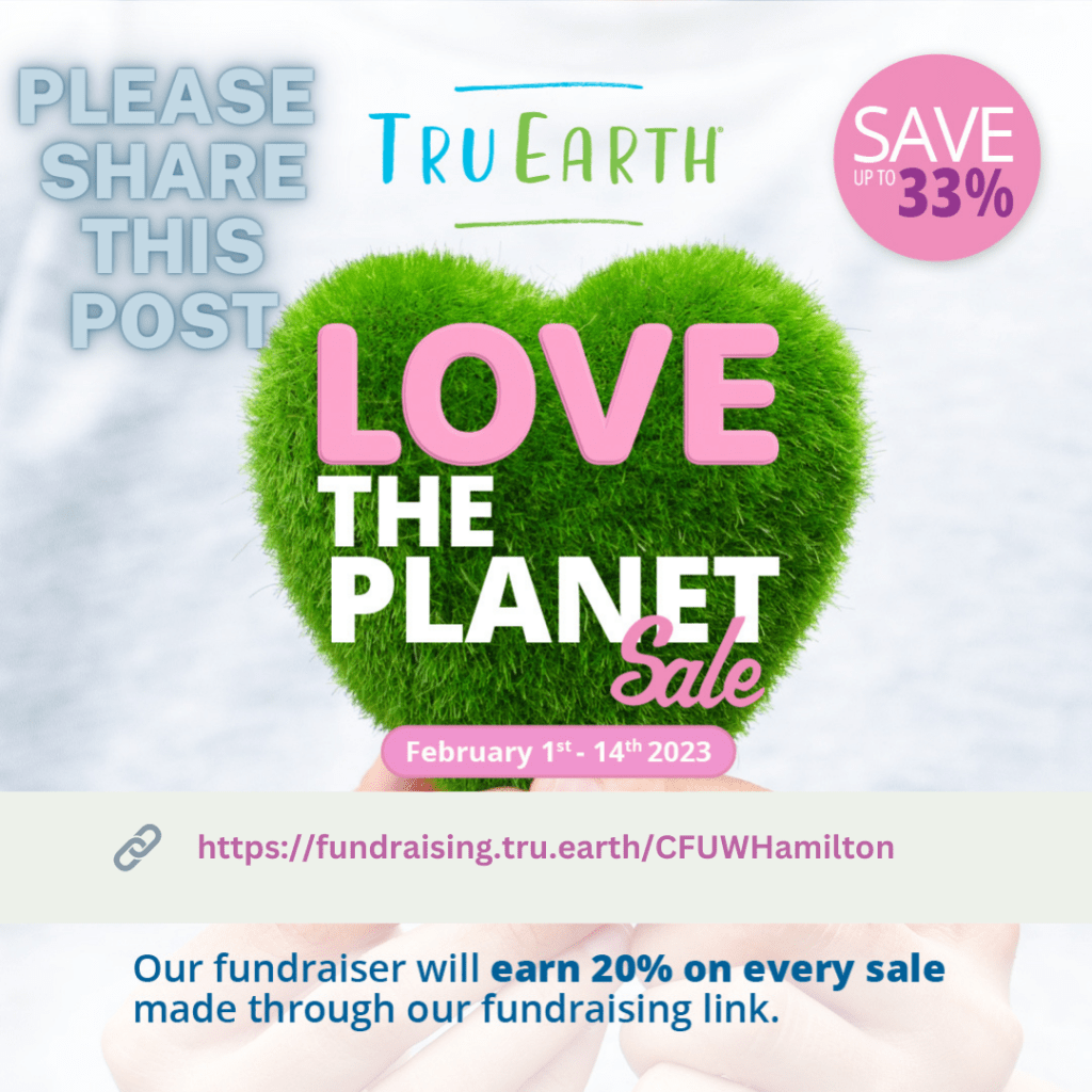 Do your LAUNDRY, save the PLANET ,help us with our Education Scholarships and save up to 33% with Tru Earth’s LOVE THE PLANET SALE. Our fundraising link is https://fundraising.tru.earth/CFUWHamilton